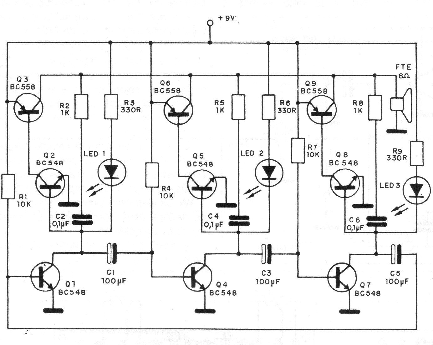 We found this circuit of light and sound effects in a 1987 publication. The sounds are reproduced by a small speaker and the light effects given by 3 LEDs. The frequency of effects can be modified by changing electrolyte values. The circuit can be powered by voltages from 6 to 12 V, the original one being 9 V.