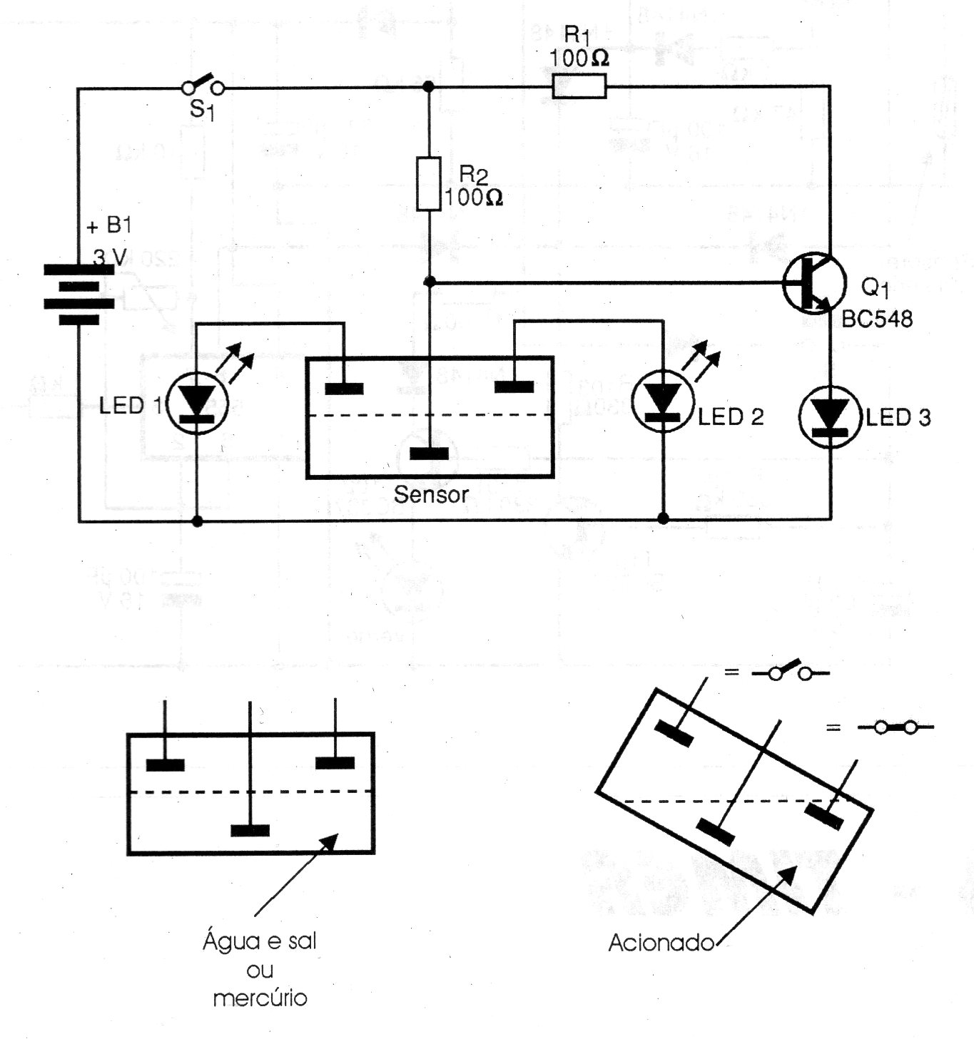 This simple circuit has three electrodes that indicate the level using mercury in a small container. The electrodes are placed as shown in the figure and the indication is made by turning on the LEDs. The circuit is powered by batteries. We remind you that mercury is an extremely toxic element and should not be handled unless you know how it should be done.