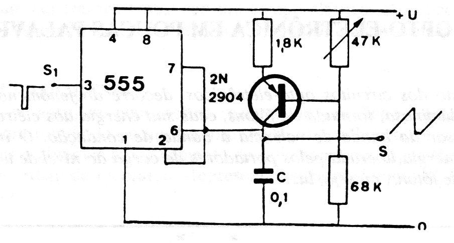 Any general-purpose transistor can be used in this circuit that generates a rise ramp that can be adjusted in the pot. The resistor in the transistor collector and C determine the frequency of the circuit that is triggered by negative pulses. The circuit can be powered by voltages from 5 to 15 V.