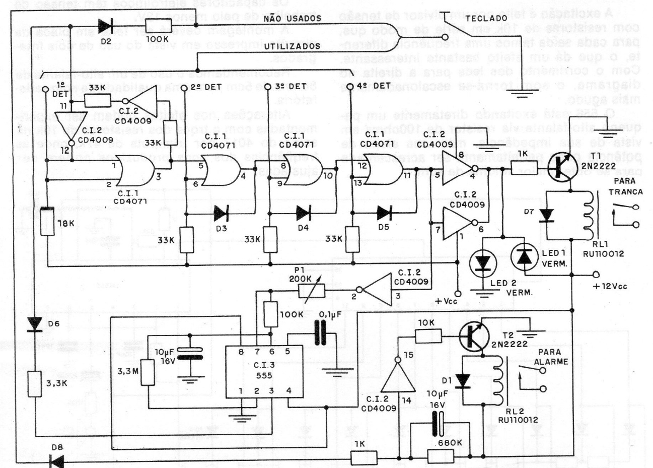 This circuit releases a lock only if the correct 4-digit sequence is entered. The circuit uses CMOS technology and can be powered by 6 or 12 V depending on the voltage of the relay used. The timing is given by 555 and the time set in P1.