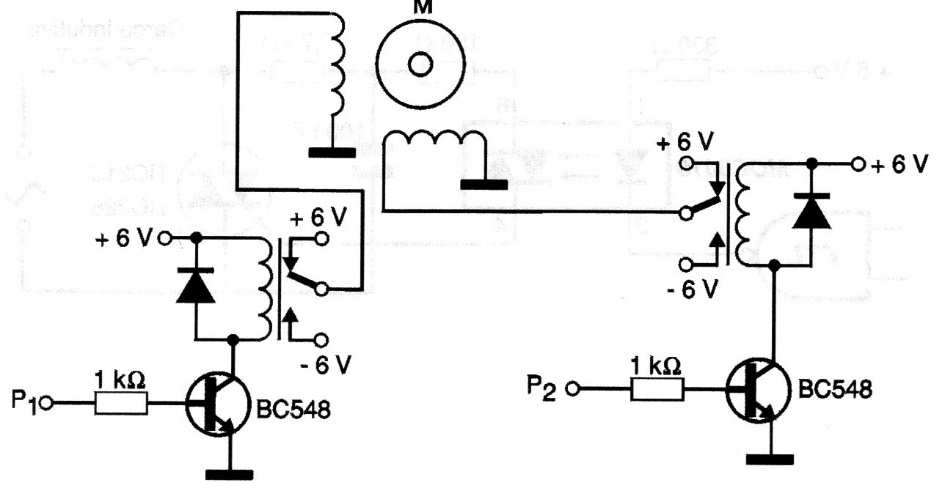 Using 5 V relays, this circuit can be used as a control shield for microcontrollers. The circuit uses relays, and the motor voltage is independent of the control voltage.