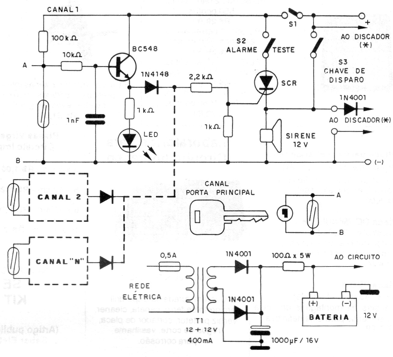 This circuit with reed sensors is very simple, feeding a 12 V siren when triggered. The circuit has a source that keeps a battery in constant charge to work in the event of power cuts and has no timing. The circuit is from a 1995 documentation.