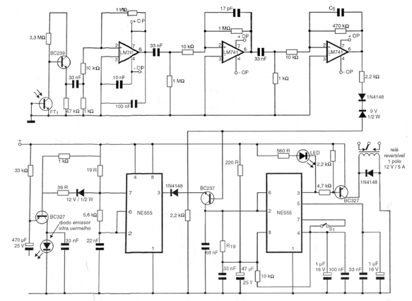 We found this circuit in a 1998 documentation. It senses the passage of people or objects through an infrared sensor, activating a relay each time the beam is cut. The circuit is powered by 12 V which is the voltage of the selected relay.