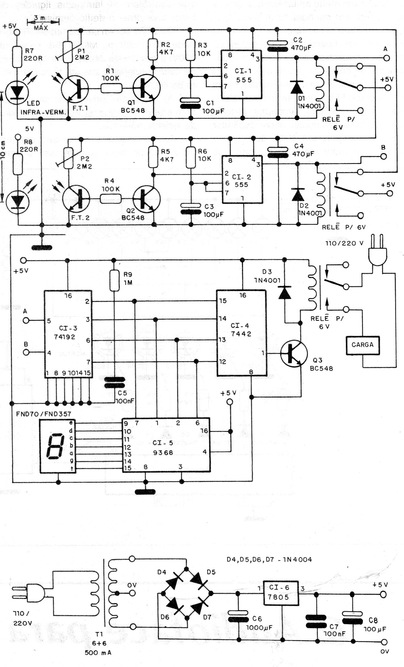 This circuit, found in a 1989 documentation, detects the direction of the object's passage, activating at the entrance and then disconnecting at the exit. The circuit makes use of 3 6 V relays which is the input voltage of the circuit. The phototransistors admit equivalents and the sensitivity adjustment is made in the trimpots.