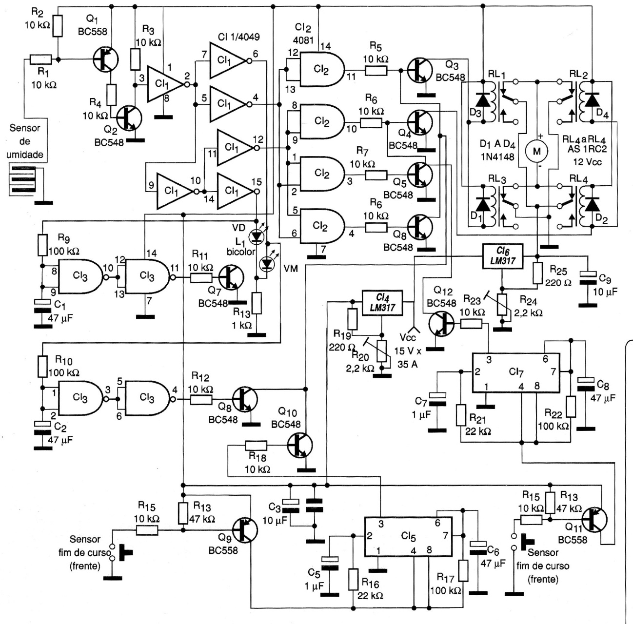 This circuit opens a reservoir when it starts to rain and closes it when the humidity sensor dries. The circuit is from 2006 documentation. The motor is controlled by an H bridge and nothing prevents the original design from being improved with the use of microcontrollers.
