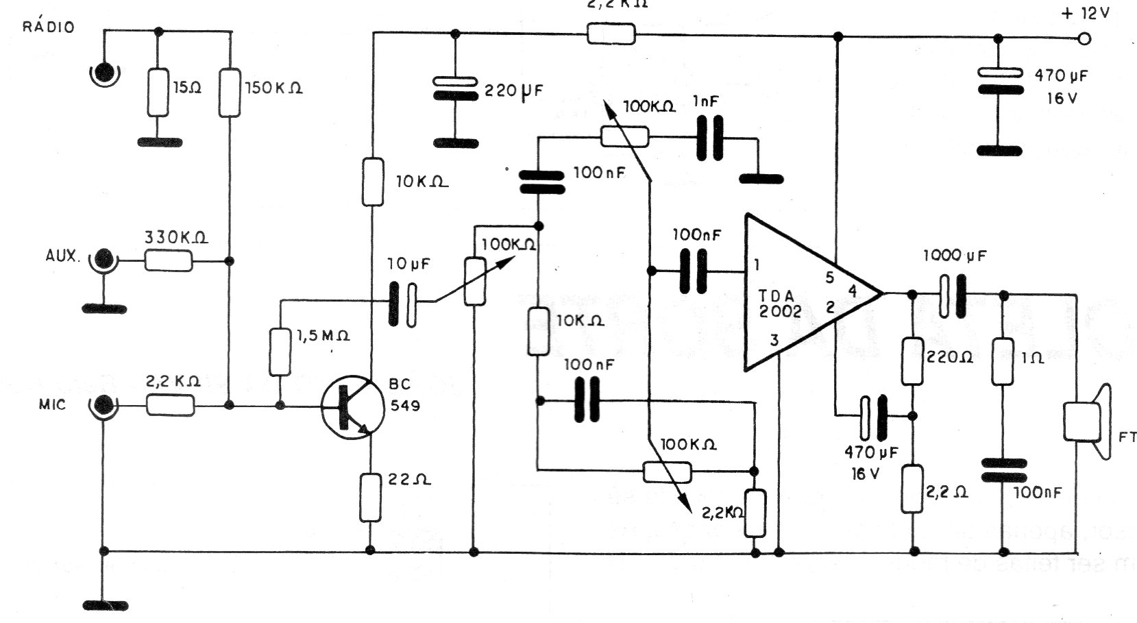 This excellent amplifier has already been presented in other configurations on this website. It is based on a TDA2002 integrated circuit and in this case includes tone and pitch control. The supply is made by 12 V of source with at least 2 A. The circuit has three inputs, according to the type of signal.