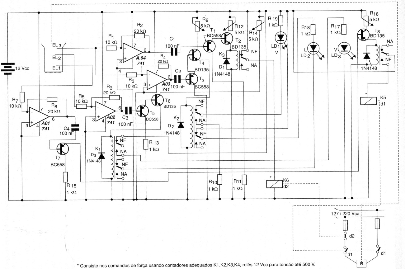 Using common components, this circuit found in a 2003 publication, controls the level of a water reservoir. Several monitoring LEDs are included. and the relays are 12 V which is the voltage used in the supply. Adjustments are made using potentiometers.