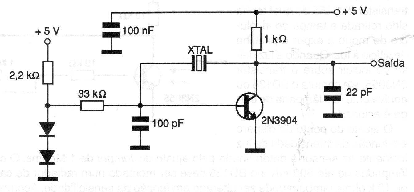 This crystal oscillator generates a 20 MHz signal. Equivalent transistors such as BF494 and 2N2222 can be used. The stabilizing diodes can be 1N4148.