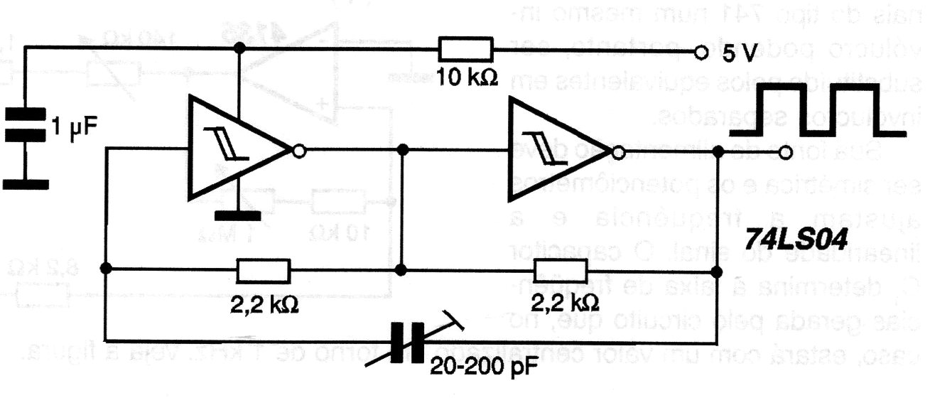 This oscillator provides a 1 MHz rectangular signal determined by the capacitors used. The circuit must be powered by a voltage of 5 V. The maximum frequency depends on the logic used.