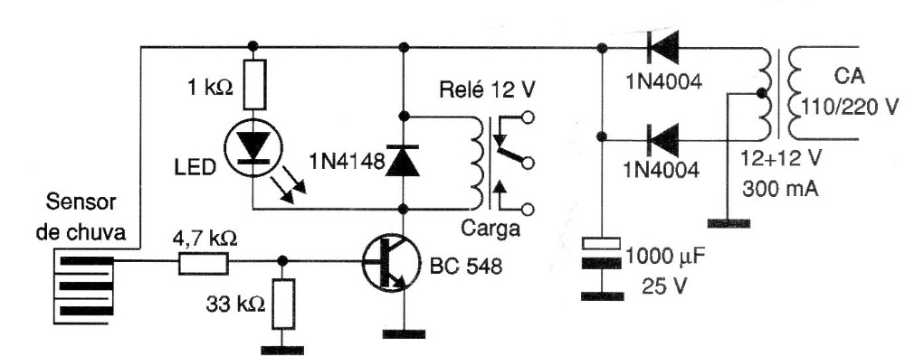 This circuit triggers a relay that can control a siren or other warning device when the first drops of rain fall on the sensor. The transformer is 12 V for relays with this voltage, but 6 V relays can be used with changing the transformer.