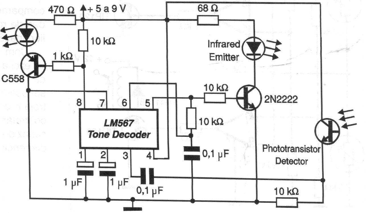 This infrared “radar” was found in a 2000 documentation. Its range varies between 20 cm and 1 meter and can be used as a motion sensor for relays and other purposes. The circuit can trigger a relay instead of the indicator LED. Its supply voltage can be 5 to 9 V which allows it to be used as a shield for microcontrollers.