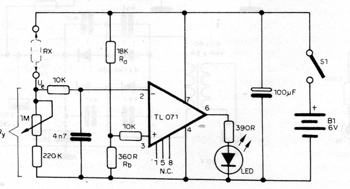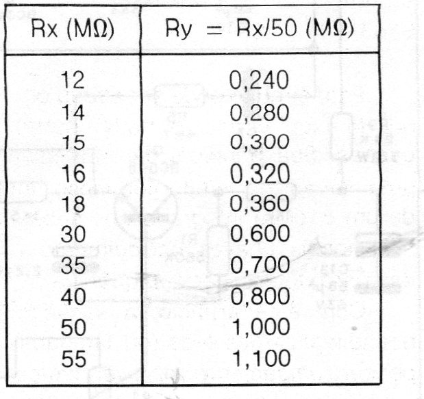 This circuit allows the measurement of resistance in the megohms range using an indicator LED and a potentiometer with calibrated scale. The circuit consists of a bridge that has the transition when the resistance of P1 becomes equal to the resistance measured according to the table.