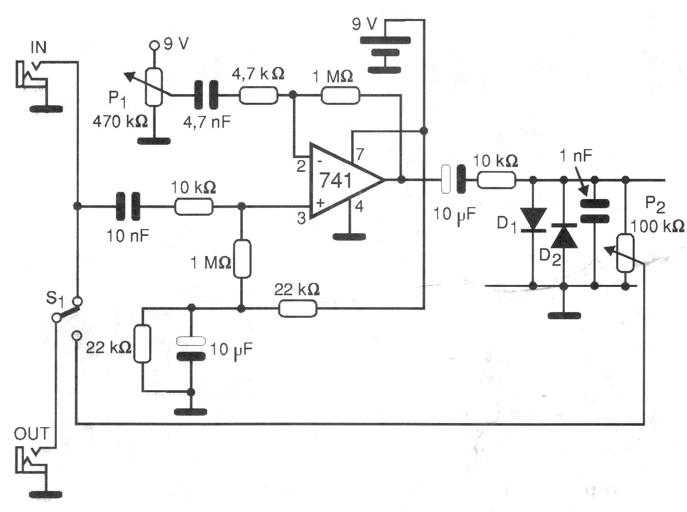 This simple circuit of effects is interspersed between the instrument and the amplifier. It is powered by a 9 V battery to minimize the effect of noise and the input and output cables must be shielded.