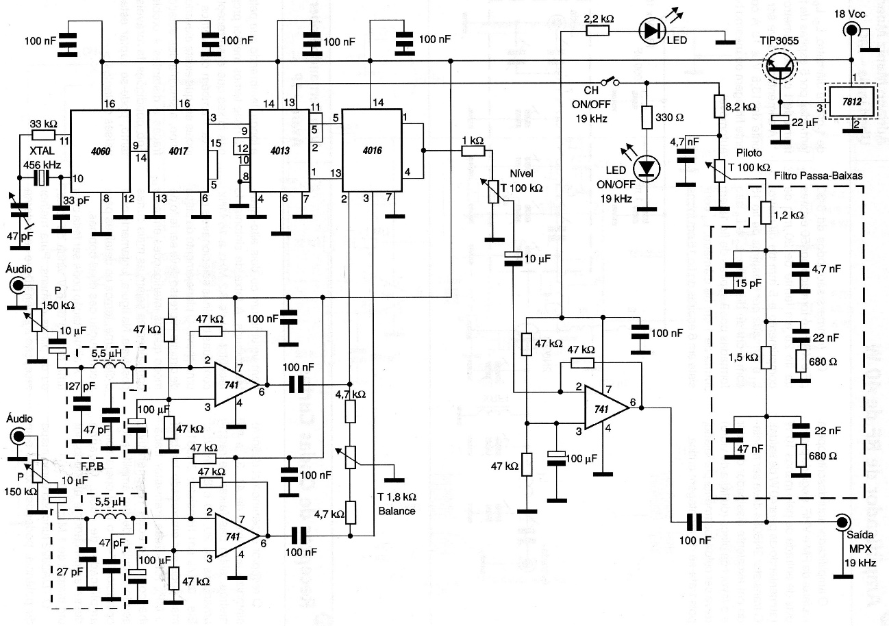 This circuit provides a multiplexed signal to be applied to the input of an FM transmitter. The circuit is complex and critical, requiring special care with the signal tracks so that no noise occurs. We found the circuit in a 2008 documentation.