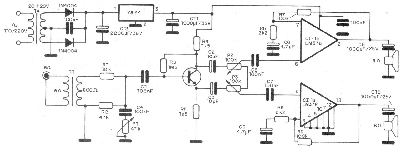 This circuit separates the signals from a monophonic amplifier with the reproduction in two speakers giving the impression of a stereo system. The power amplifier used is uncommon today, but more modern and more powerful integrated ones can be used instead.