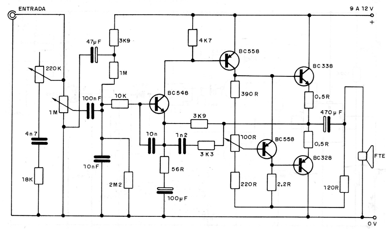 This transistor amplifier with complementary symmetry configuration can provide approximately 1 W of power and is ideal for use on the bench or as a stage for small receivers and intercoms. The circuit can be powered by voltages of 9 to 12 V and the speaker used is 4 or 8 ohms.