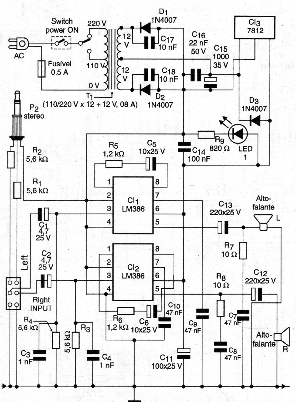 This stereo amplifier was found in a 2005 documentation. The circuit uses two integrated amplifiers that are still common in our market, providing reasonable power per channel. The voltage regulator must have a heat sink and the transformer has a current of 600 to 800 mA.