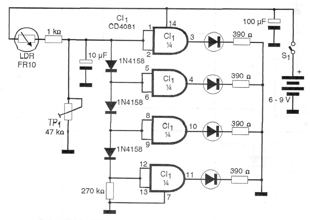 This simple Bargraph photometer with 4 LEDs was found in a 1997 documentation. The scale is adjusted in a trimpot and the sensor can be any common LDR. Power can be supplied by cells or battery.
