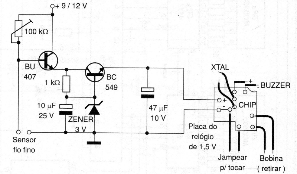 In the figure we have the way to use a low-cost digital clock chip to trigger an alarm. The circuit is from 2003 documentation. The power must be supplied with voltages from 9 to 12 V. The power transistor does not need to be equipped with a heat sink.