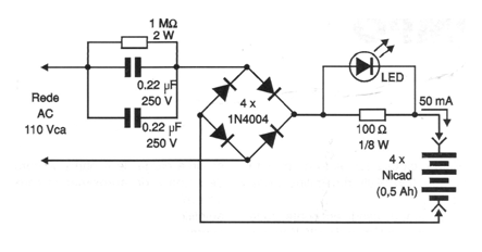 This simple low-current charger does not use a transformer, having been found in a 2001 documentation. The input capacitors must be made of metallized polyester and the circuit is suitable for small or medium Nicad batteries.