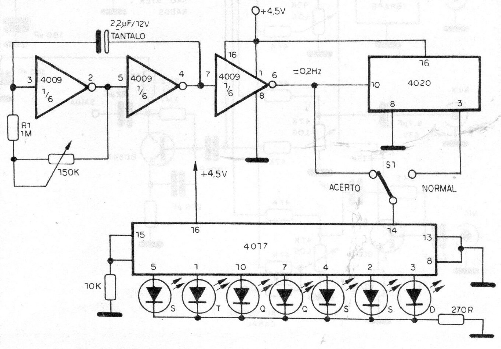 We found this CMOS circuit in a 1989 documentation. The accuracy will depend on the adjustment that is made in the trimpot. This adjustment is made by adjusting the trimpot so that the LEDs change once every 5 seconds approximately. The circuit is powered by 3 or 4 small batteries or a 5 or 6 V source.