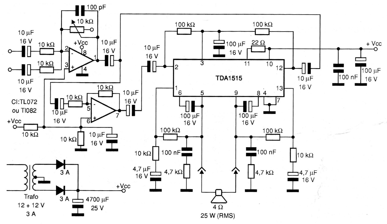The circuit presented was found in a 2009 publication, and is based on the TDA1515 integrated circuit, which is a full-channel two-channel audio amplifier capable of providing 25 Wrms with a 4-ohm load and configured in a bridge. For an amplifier to work in this configuration it is necessary that the audio signals at the inputs are 180º out of phase with each other. This is achieved by the two operational amplifiers that are in the inverter configuration. The first reverses 180º and the second reverses the first and its outputs are connected to the inputs of the TDA1515. The 10 k potentiometer acts as a volume control. The input of the first operator works as an adder and can be connected, for example, the outputs L (left) and R (right) of a CD player together.