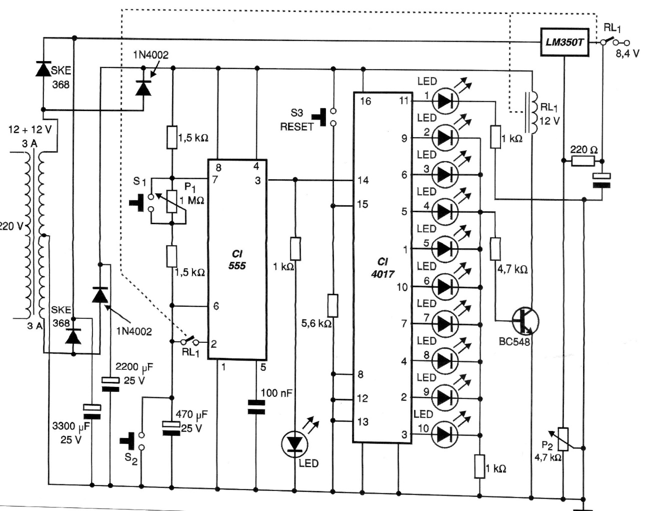This 2000 circuit, found in the documentation of the time, is intended for charging this type of battery, which requires high currents and a longer charging time with stabilized current. The circuit monitors the load through 10 LEDs and the voltage regulator must be mounted on a heat sink. InfoLITHIUM batteries were used in camcorders at the time.