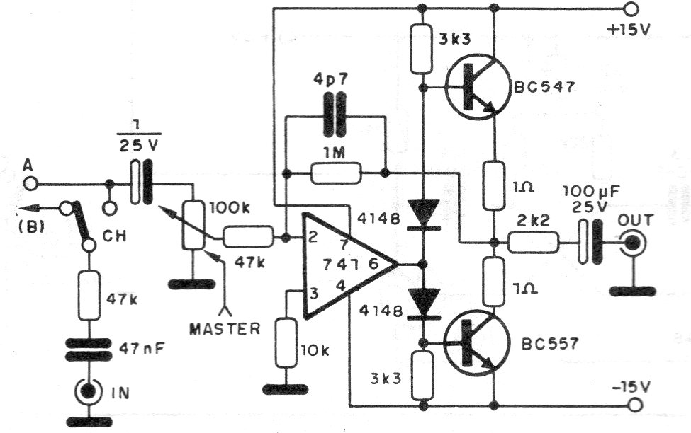 This small amplifier with transistor output provides 1W to 2W of power. The circuit can be used as a monitor for the CB17350E mixer or in other applications. The power supply must be symmetrical from 6 to 12 V.