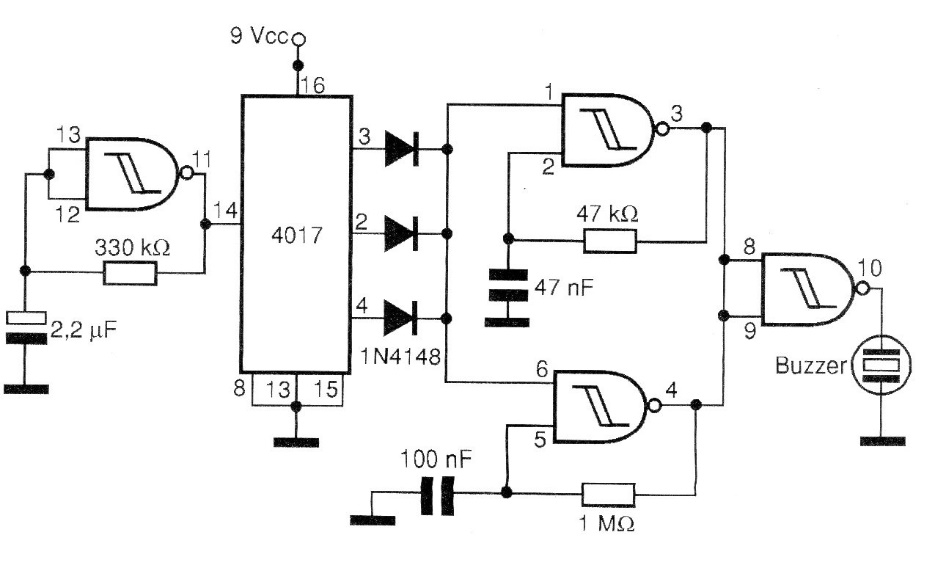 This circuit simulates the call tone of a telephone. The transducer is a high impedance capsule, and the power can be supplied with voltages from 5 to 12 V. The capacitors must eventually be changed to reach the desired sound.