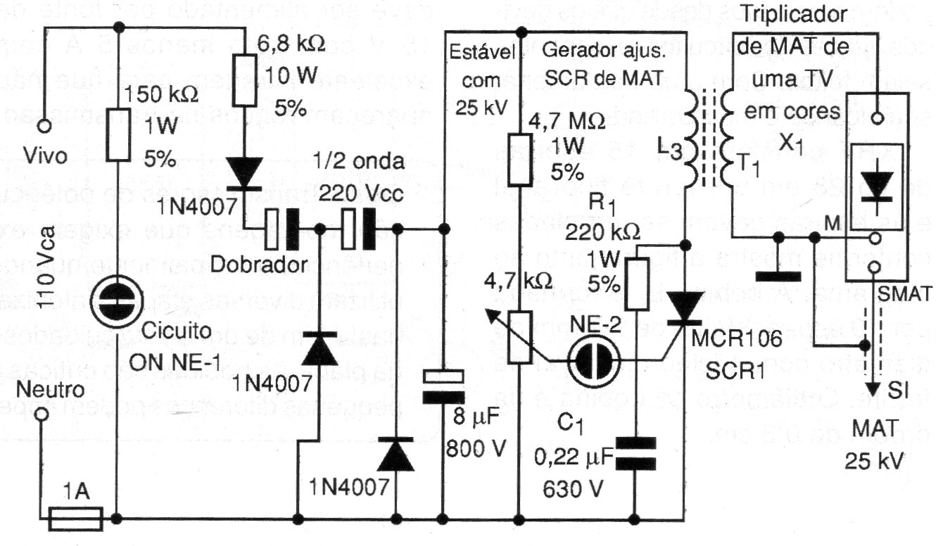 The circuit consists of a MAT (Very High Voltage) oscillator that, applied to a protected metal grid placed in an ultraviolet lamp oven to attract insects, fulminates any insect that tries to pass through it. We found this configuration in a 2009 documentation. The circuit is formed by a relaxation oscillator with a voltage and low current doubler, capable of generating pulses that are applied to a MAT transformer. The low consumption current makes the consumption very low, which allows the device to be constantly on without danger of significant increase in the energy bill. The circuit also powers the set of ultraviolet lamps. In the suggested assembly, the lamps are in the center and around the grid, which will be energized with high voltage, in a cylindrical shape. The neon lamp must be protected from light, as this affects its shooting characteristics. The coils L1 and L2 are formed by 100 turns of 18 AWG wire in a ferrite rod 10 to 15 cm long with a diameter of 1 cm. L3 has 8 to 10 turns of 22 AWG wire. T1 is an old color TV flyback (unshielded). X1 is a color TV voltage triple. The L4 and L5 coils consist of ballasts for fluorescent lamps of 20 W x 110 Vac.