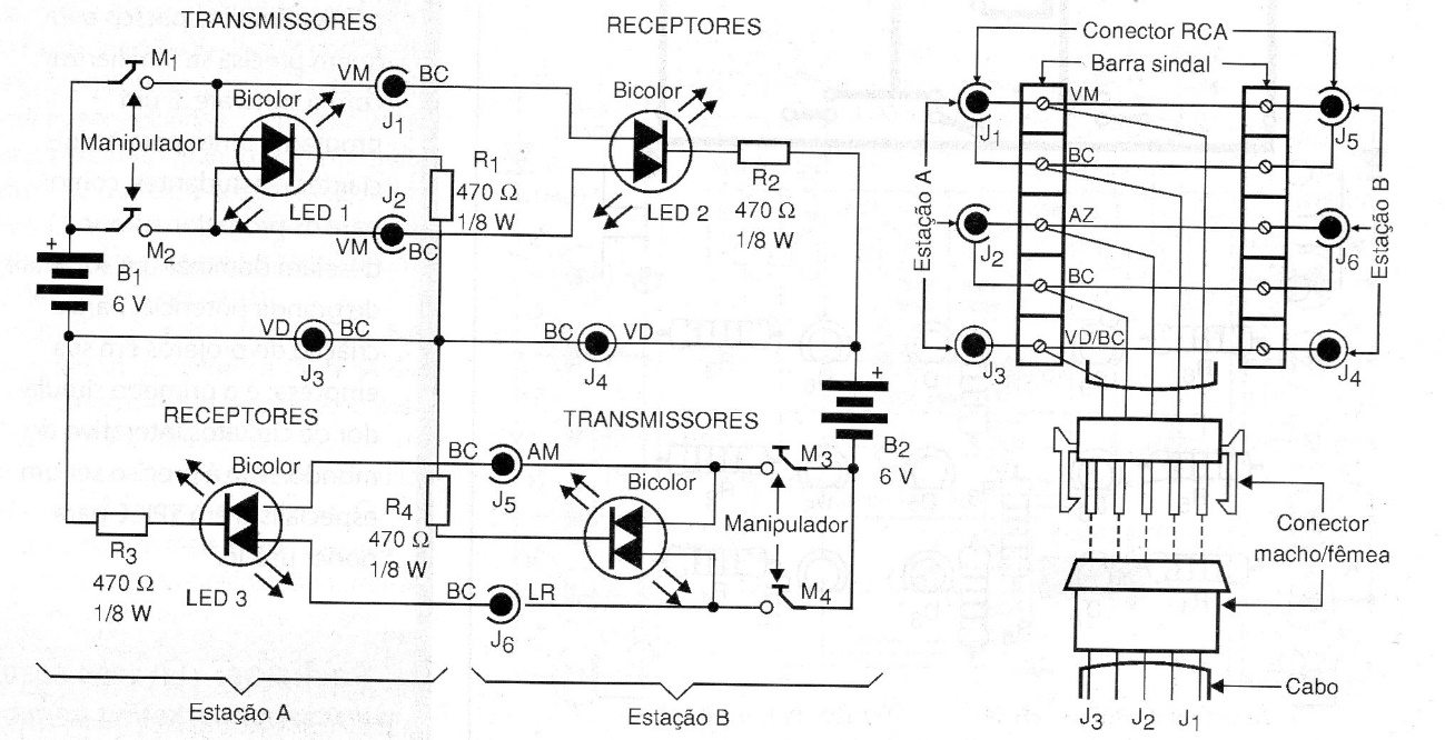 The telegraph communication system has been out of use for a long time, so the montage presented has much more a didactic purpose or even to be presented at a fair as a curiosity. In the telegraph, touches that represent points (short touch) and dashes (long touch) are sent, thus forming the signals sent according to the code created by Samuel Morse, therefore being known as Morse Code. Signals can be transmitted either by physical means, such as wires, or through waves, such as light or electromagnetic waves. The proposed telegraph is slightly modified but follows the basic principle. The device that forms the transmitter was built with two manipulators to operate as follows: in transmission the bicolor LED (red) indicates dots and dashes, and the bicolor LED (green) indicates capital letters or the beginning of words. See our website for more information on Morse Code. The connectors for the interconnections between stations A and B are just a suggestion.