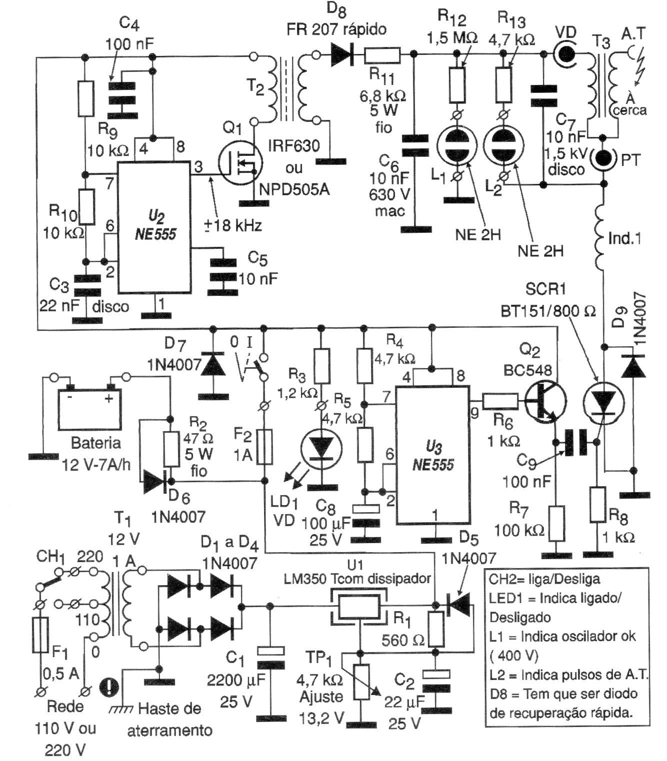 The described electrifier is low cost and easy to assemble. The voltage transformer raises 12 V to approximately 400 V, being easy to build. The Ind1 inductor is also quite simple. The T3 ignition coil is the type used on motorcycles with a capacitive discharge ignition system that does not have to be new either. Just be in good condition. T2 construction: E-48 ferrite core (48 mm2 central section) - primary winding with 30 turns of wire 28 and secondary with 150 turns of wire 32 or thinner. Construction of Ind1: 20 turns of wire 24 or 26 in spool with central section of 66 mm square, without core. It is advisable to use fiberglass plate.