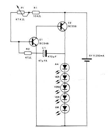 This traditional flasher configuration with two transistors drives 5 LEDs with a supply that must be at least 12 V. For fewer LEDs, the supply can be made with lower voltage. The frequency is controlled by P1.