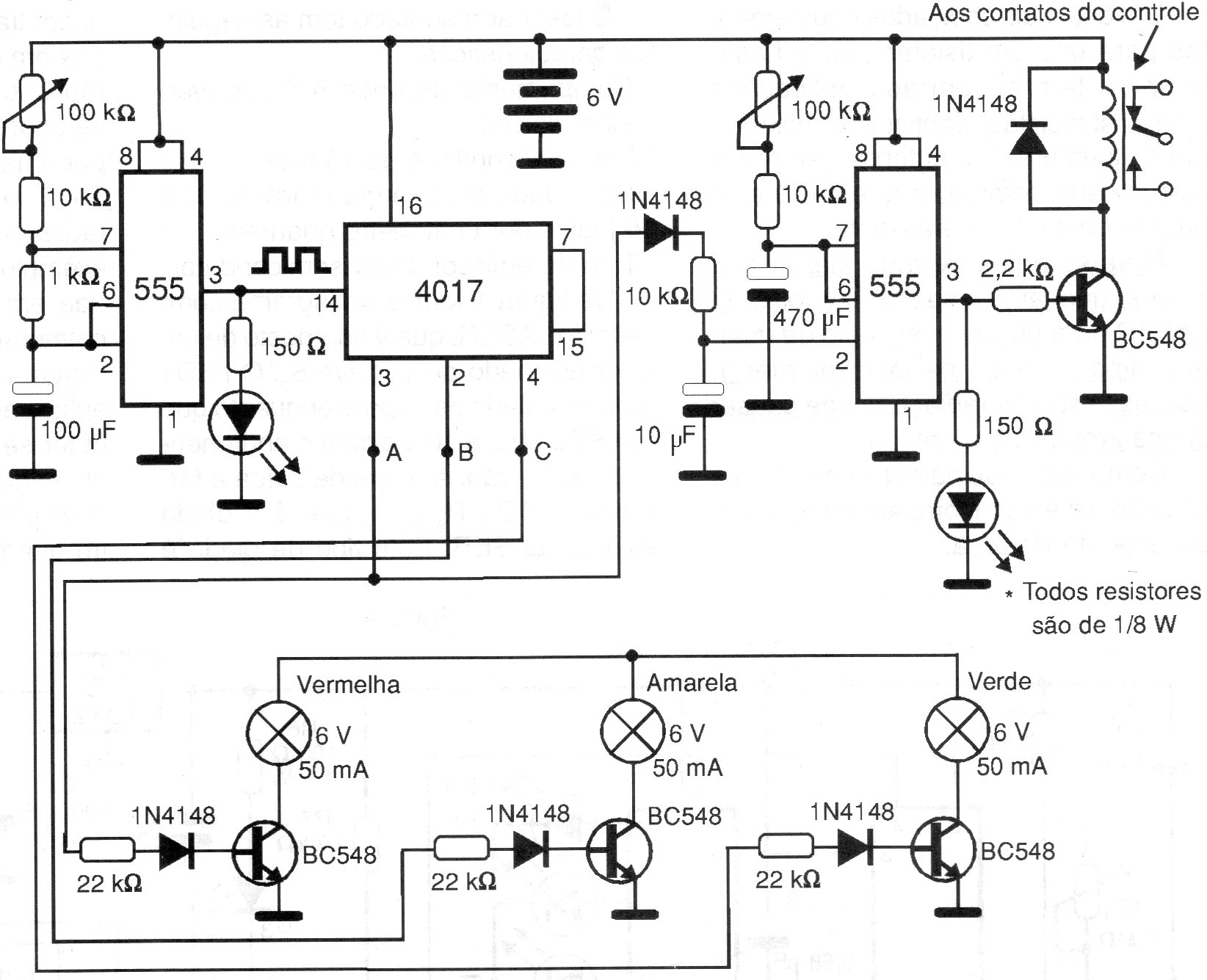 This circuit was found in a 1999 documentation, but it can still be easily assembled today, as the components used are still common. The circuit activates 3 lamps but can be easily changed to activate LEDs. The times are adjusted in the potentiometers that also allow the enabling of a remote system.