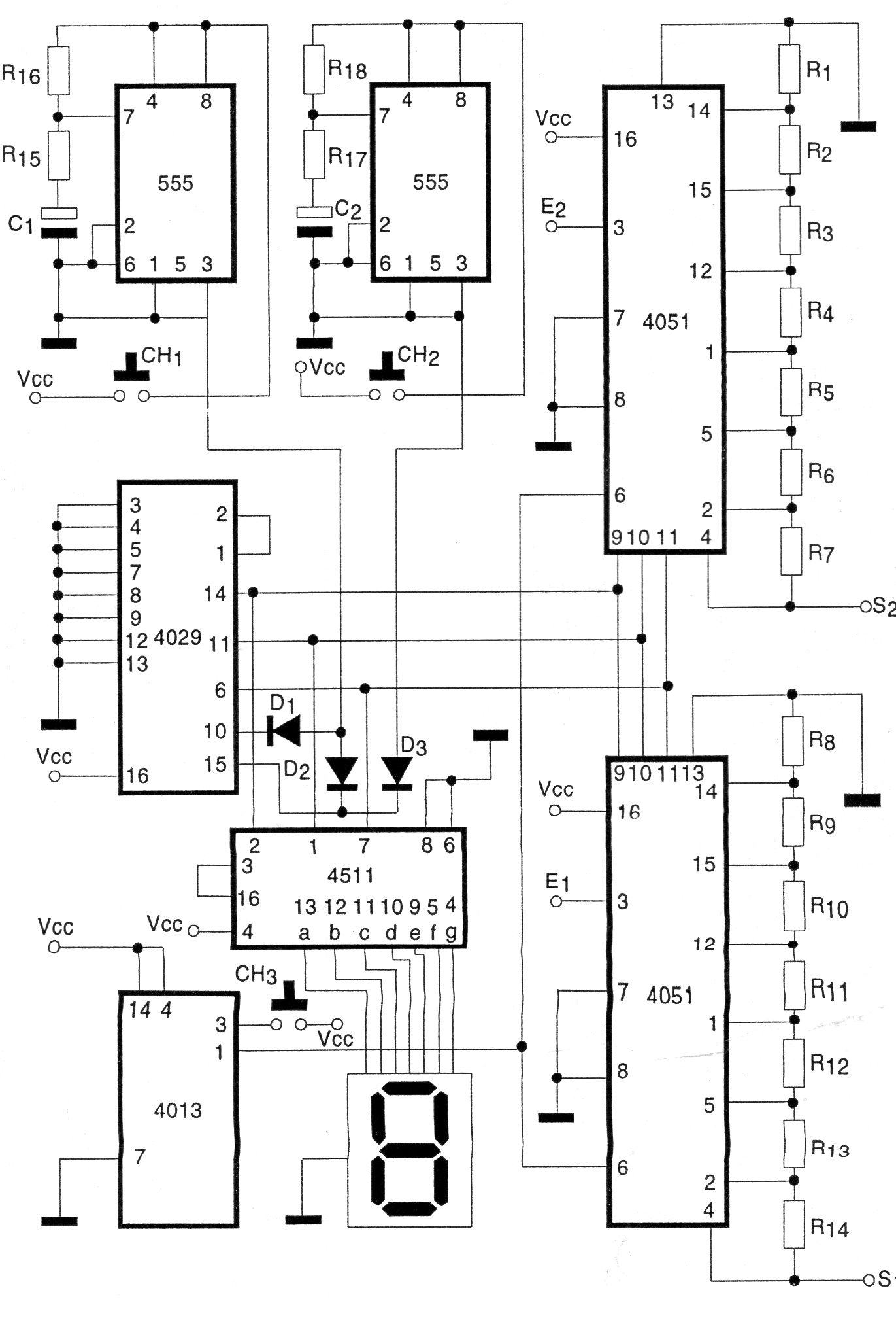 This 1998 circuit controls the volume in a stereo system by touching switches. The circuit is for small signals. The resistors from R1 to R14 and R17 are 2k2. The resistors from R16 to R18 are 10 k. the diodes are 1N4148 and the capacitors are 100 uF.