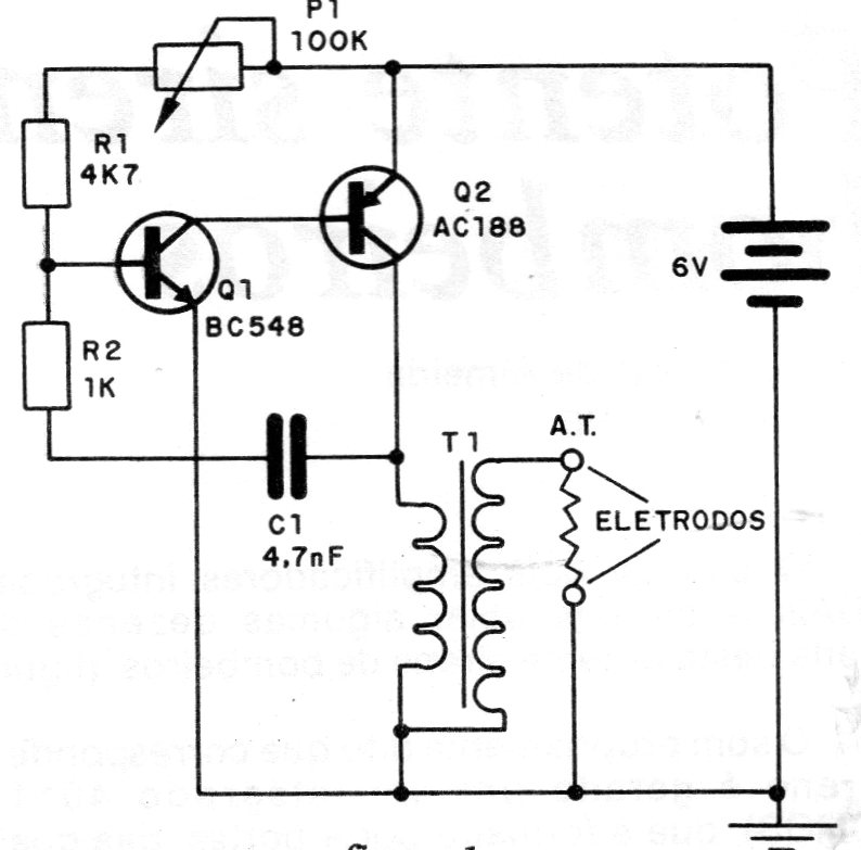 This simple MAT generator circuit was found in a 1986 documentation. The Q2 transistor can be replaced by a BD136 as the germanium original is not common today. This transistor, as well as the equivalent, must be mounted on a heatsink. T1 is an automobile ignition coil. With the TIP32 to Q2 the circuit will work with 12 V with greater power.