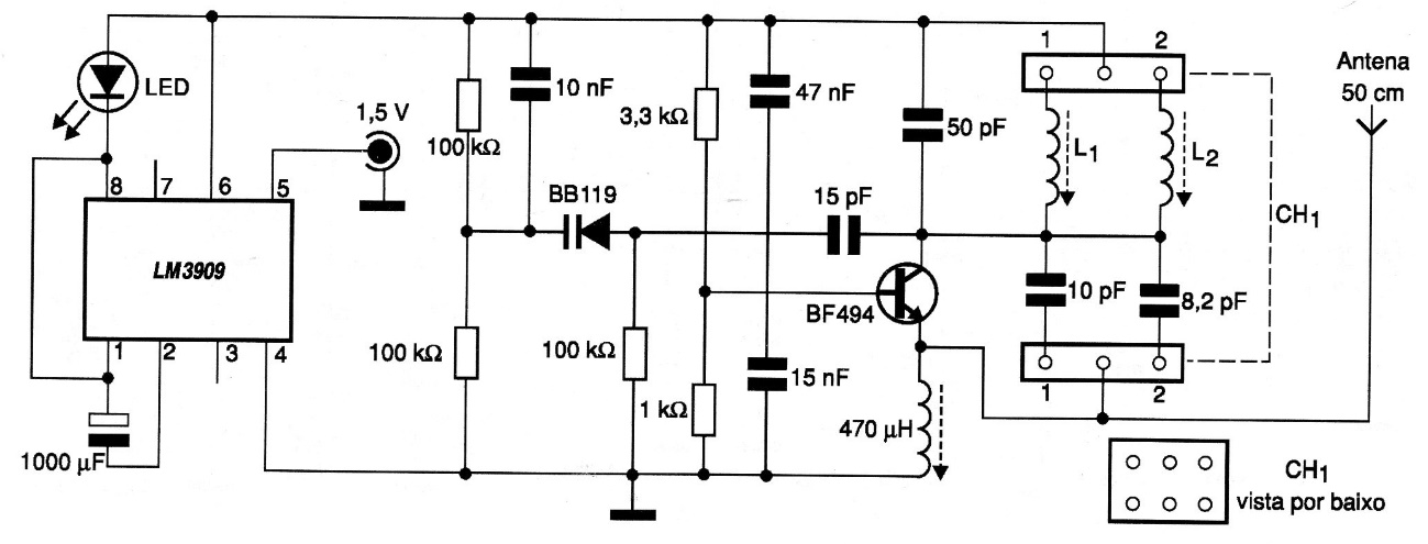 This circuit has a consumption of only 3.7 mA and can be installed in vehicles or objects for tracking using a common FM receiver. The range is a few tens of meters. L1 and L2 can be selected for different frequencies. L1 has 4 turns of wire 28 with an adjustable core of 0.5 cm and L2 has 2 turns of wire 25 in the form of 0.5 cm with adjustable core.