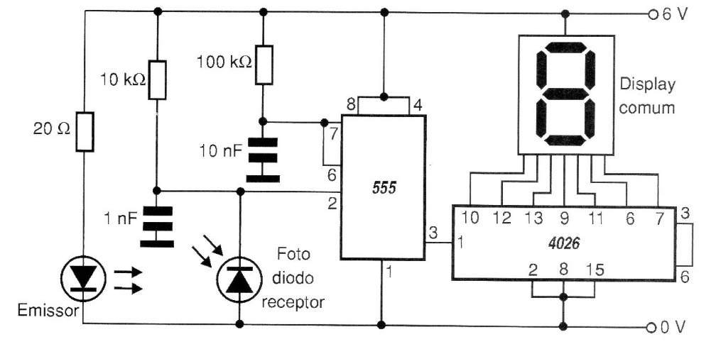 In the proposed circuit, each pulse of light or infrared radiation that hits the photodiode generates a pulse whose duration depends on the RC network connected at peaks 6 and 7 of the 555. This pulse is counted by the 4026 which directly excites an anode display common. The circuit is supplied with a voltage of 6 V. The sensitivity can be adjusted by connecting in series with the 10k resistor on pin 2 of the CI of a 1 M ohms trimpot. For greater directivity and sensitivity, the photodiode can be mounted on an opaque tube with a lens. The reader can also improve the circuit by increasing the number of digits, thus enabling counting to 99 or even 999.