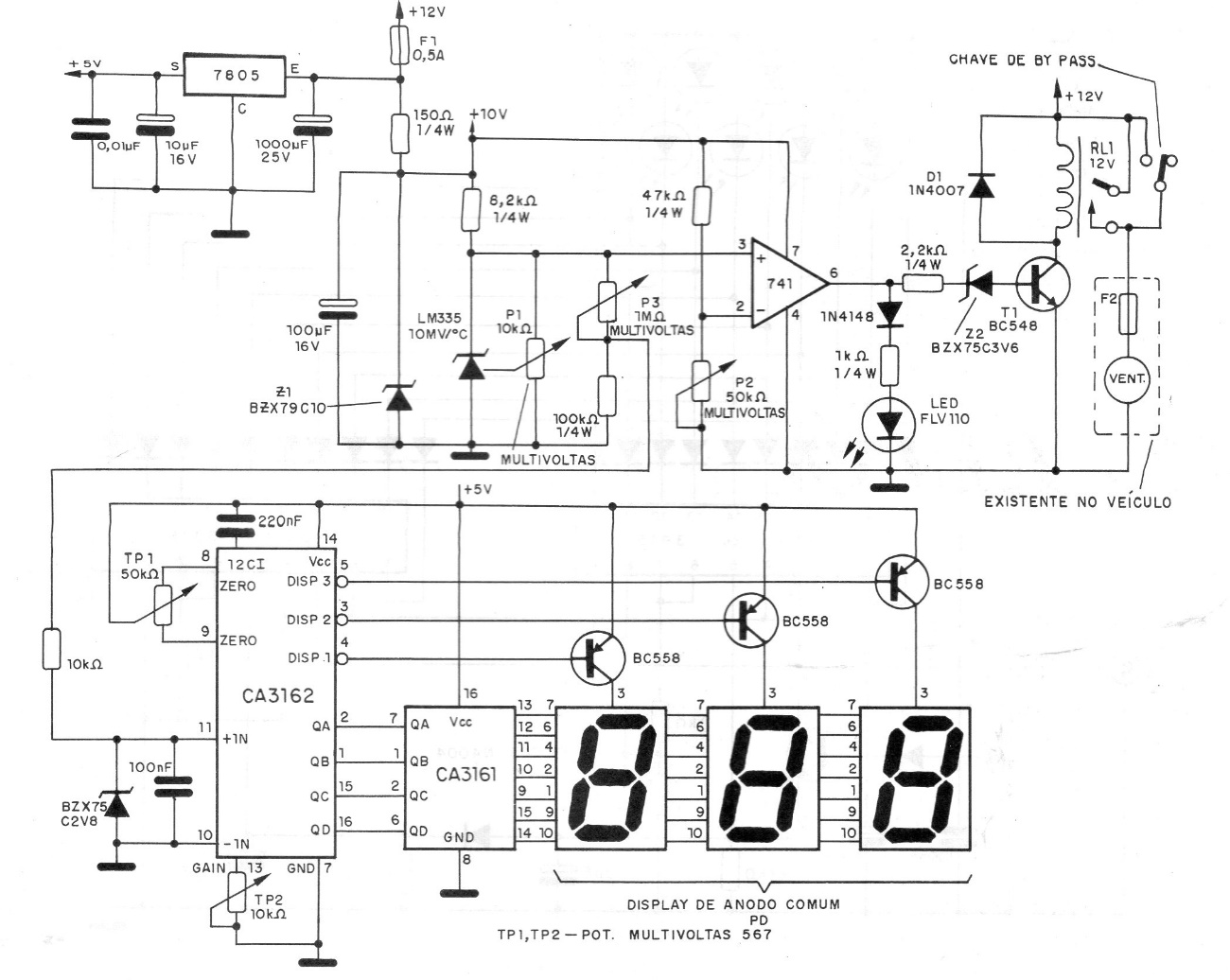 This circuit was originally designed to monitor the temperature of a vehicle. The integrated circuits for driving the displays are not very common today. The circuit adjustments that correspond to the scale and temperature are made through trimpots. The circuit is powered by a voltage of 12 V with a regulator of 5 V.