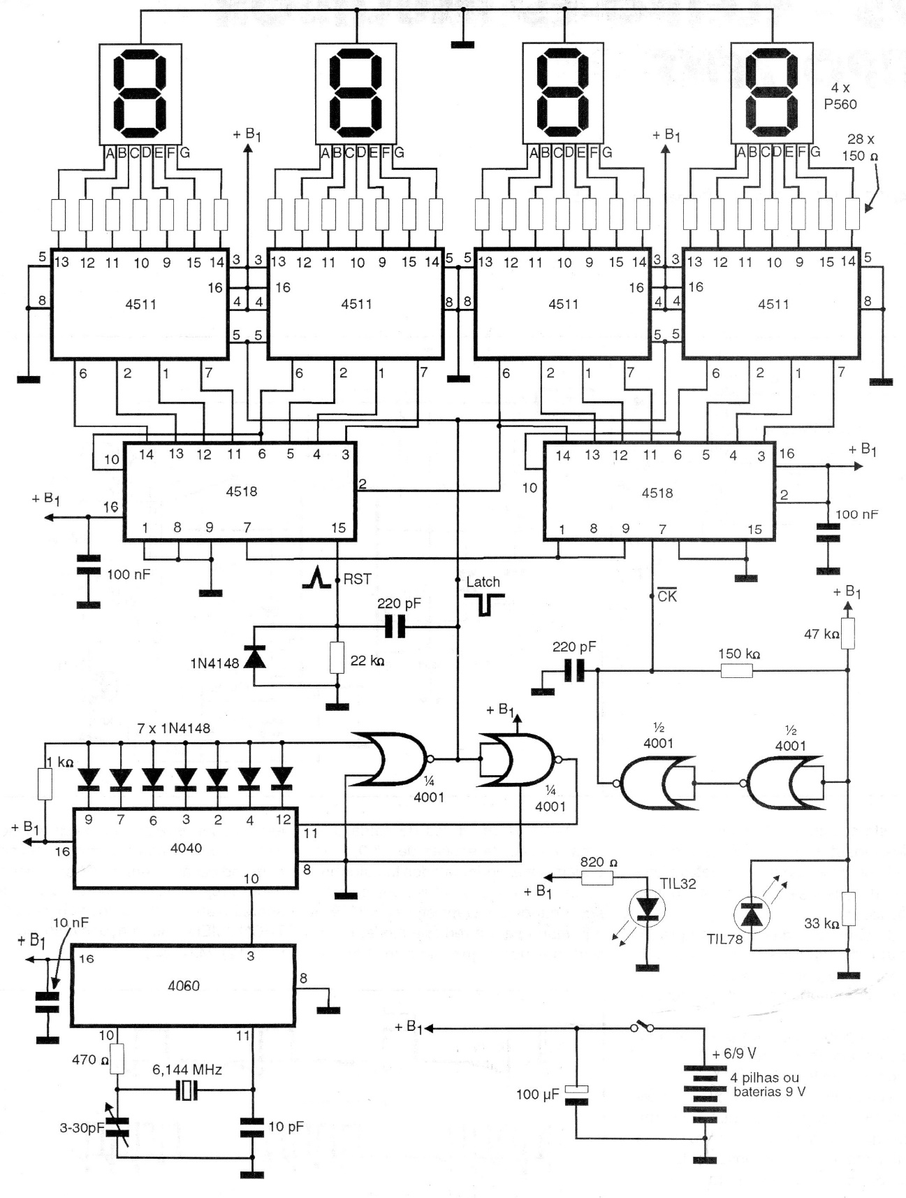 This 4-digit counter was found in a 1997 documentation. It uses CMOS integrated circuits and can work with voltages of 6 or 9 V. The displays are of common cathode and the input signal must be rectangular free from bouncing. We recommend using medium or large batteries, or even a source, given the consumption of the displays.