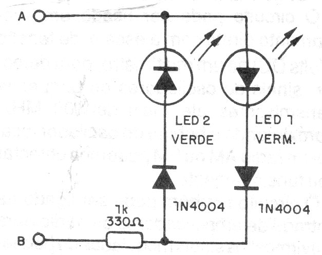 This ultra-simple polarity indicator uses common green and red LEDs and can work with 3 to 9 V sources. For higher voltages, increase the resistor to 1k (up to 12V) and 1k5 for voltages up to 15 V. The circuit will indicate that the voltage is alternated with the lighting of the two LEDs.