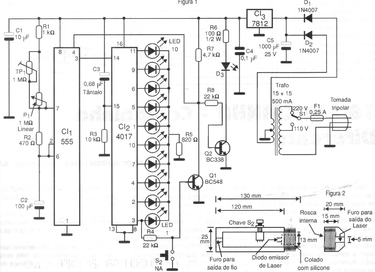This circuit allows feeding a small semiconductor laser to obtain a useful resource for physiotherapy. The circuit has a flow effect due to the setting of P1 and pulsates a semiconductor laser. The source is included, and the components are still common in the specialized market. The circuit is from 1999 documentation.