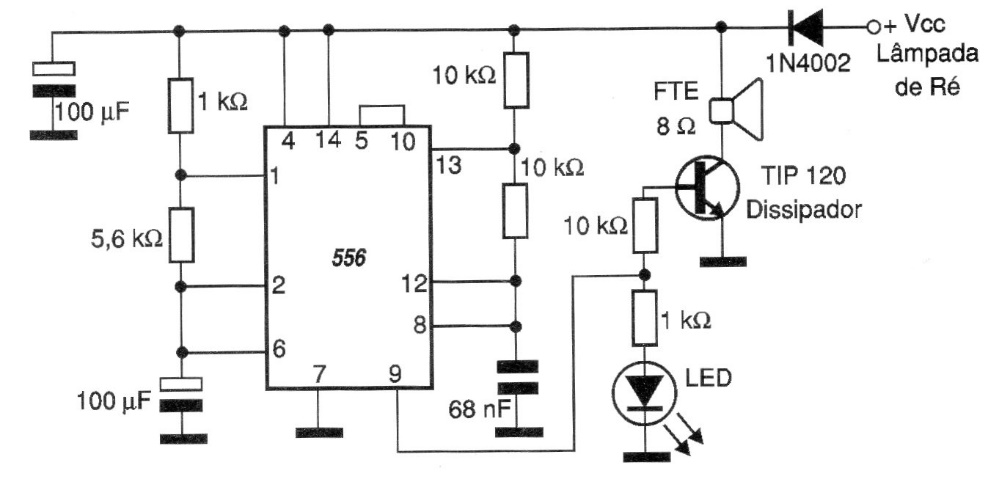 This circuit serves as a reverse warning for the car. When the reverse is activated, the circuit triggers an audible signal that warns whoever is behind the car that the vehicle is going to move backwards. The circuit consists of two oscillators, the first will trigger the following which will trigger and cut the 8 ohms speaker output. The circuit is powered by the 12 V voltage of the reverse light. When the reverse light comes on, the circuit will be powered. A reverse polarity protection diode protects the alarm circuit. Changes in both the activation time of the audible signal and tone can be made in the values of the capacitors and resistors connected to pins 1,2,6 and 13.12 and 8 of the CI-556, which is a double 555. Use a heat sink small on the TIP120. The circuit can be placed in a plastic box and installed in the rear bumper where the reverse lamp is.