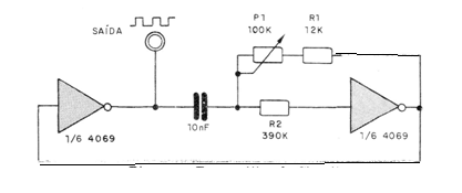 This version of an astable CMOS with the 4069, and which appears elsewhere on this site and in this section, is from 1986. The circuit can be powered by voltages from 3 to 15 V and the frequency adjusted over a wide range of values by P1 is given basically by the capacitor.