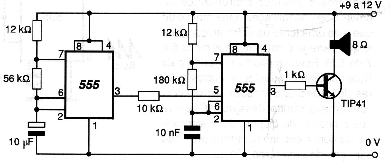 This siren configuration using the 555 has already been explored in other circuits on this site. In this case, the power stage uses a TIP41 that must be provided with a heat sink for higher voltages. The circuit can be powered by voltages from 9 to 12 V.