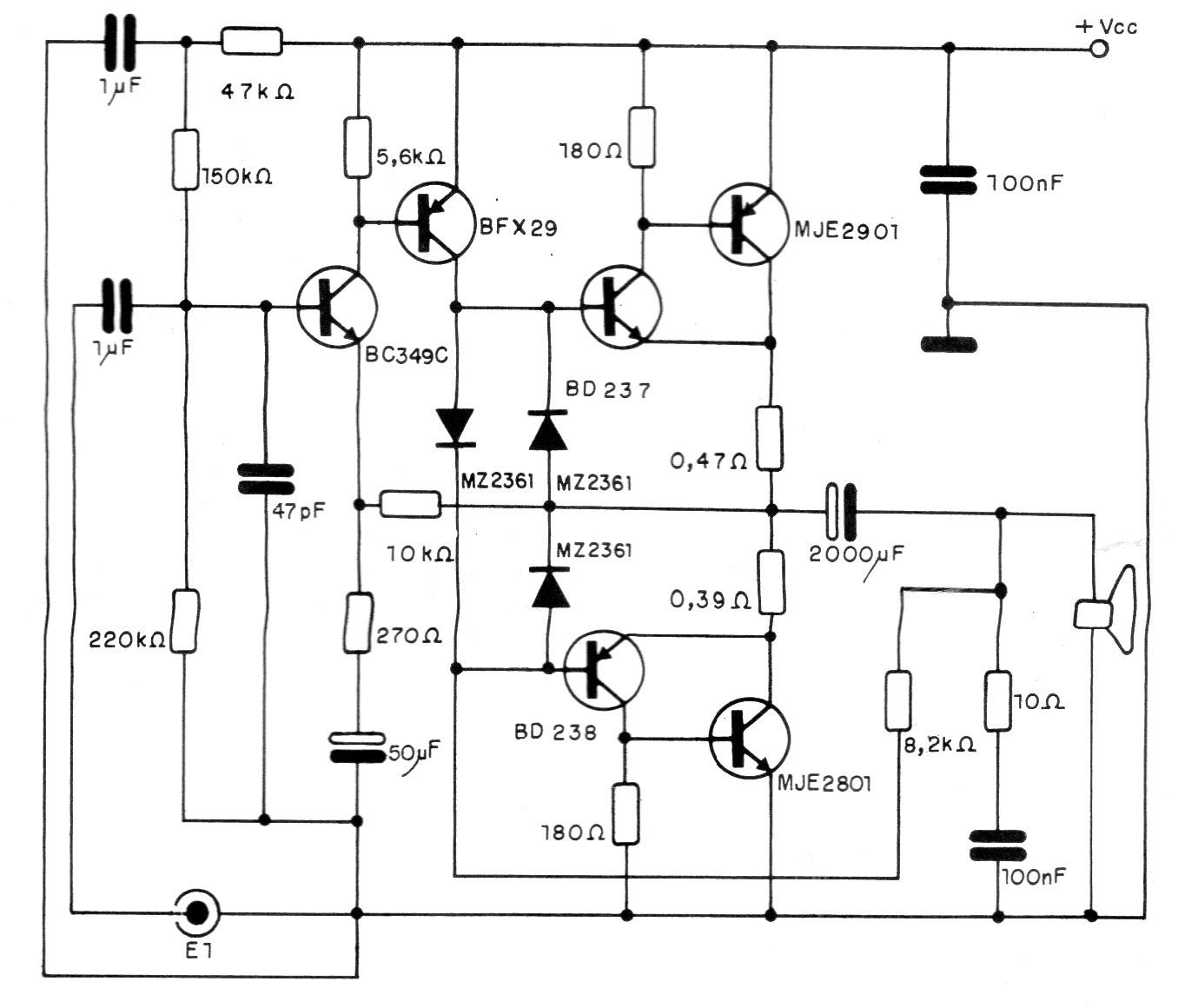 This transistor amplifier provides 35 W of power to an 8 ohms speaker and must be powered by a 59 V source with 2 A. The transistors must be equipped with heat sinks. For a stereo version, the source current must be doubled, and two channels must be mounted. The input sensitivity is 1 Vpp.