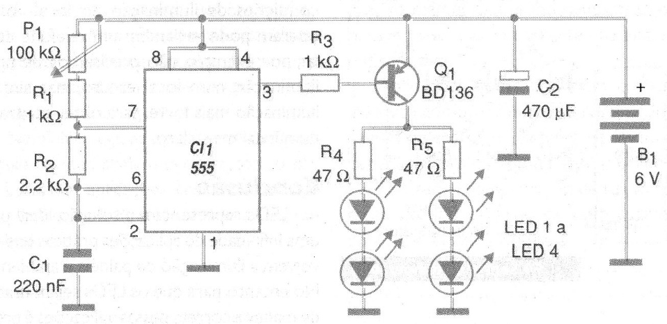 With this simple circuit we can control the brightness of a set of LEDs of any color through modulation. The adjustment is made by P1 and the supply voltage can be between 5 and 15 V. The resistor in series with the LEDs depends on the maximum current desired.