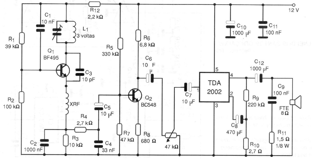 What sets this 1999 project apart from many that can be found on the site with super-regenerative configurations is the use of a TDA2002. This amplifier provides high audio power. L1 can have 1 to 3 turns of wire 22 to 26 in the form of 1 cm without core and XRF consists of 30 or 40 turns of wire 32 in a 100k x ½ W resistor; The antenna is connected to the Q1 collector, being of the telescopic type.