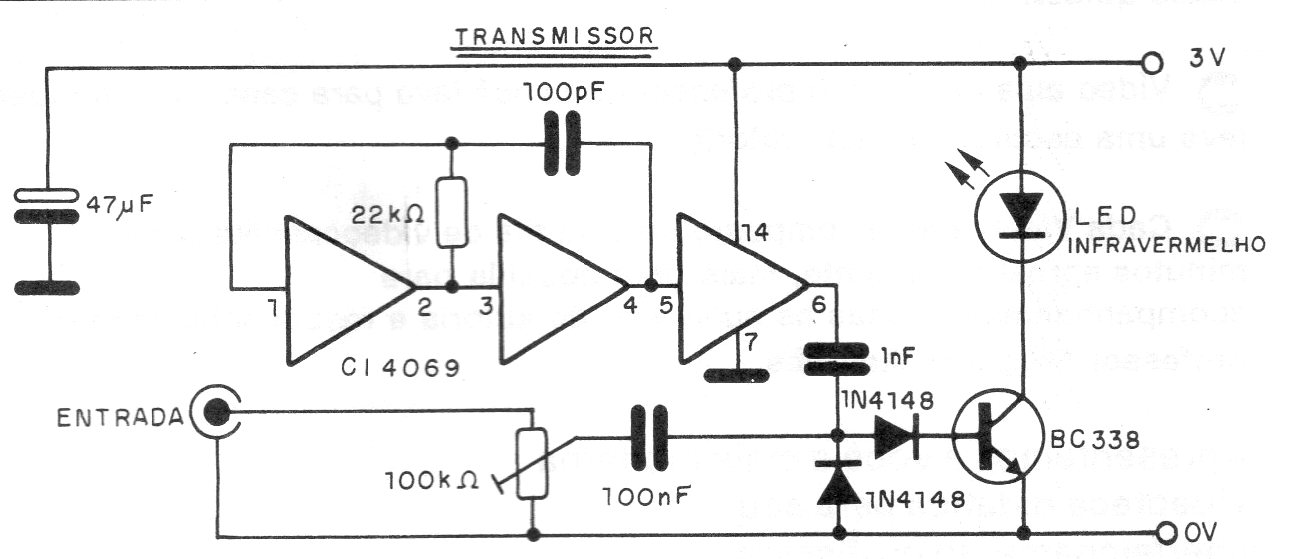 This circuit serves as the basis for an infrared audio link, using a remote sound for a wireless headset. The circuit has a good range if the emitter is installed in an opaque tube with a lens. The circuit is powered by a voltage of only 3 V but can be powered by 6 V if a higher power emitting LED is used.