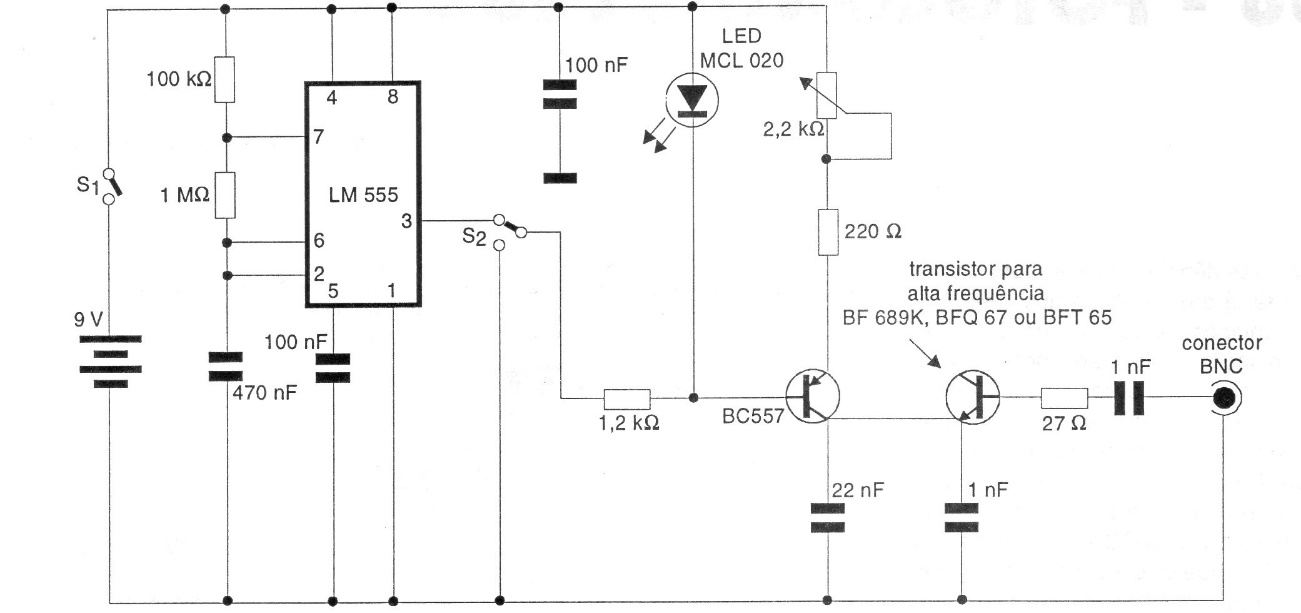 This circuit generates a signal rich in harmonics that extends up to close to 1 GHz, serving for testing RF equipment. The circuit takes advantage of the junction noise of a high frequency transistor when the emitter-base junction is polarized in reverse.